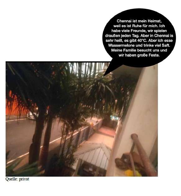 »Chennai ist meine Heimat, weil es ist Ruhe für mich. Ich habe viele Freunde, wir spielen draußen jeden Tag. Aber in Chennai ist es sehr heiß, um die 40 Grad. Meine Familie besucht uns und wir haben große Feste.«